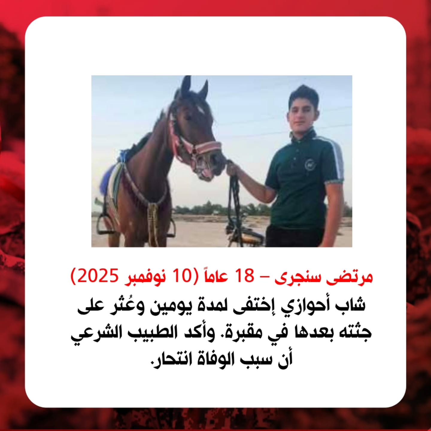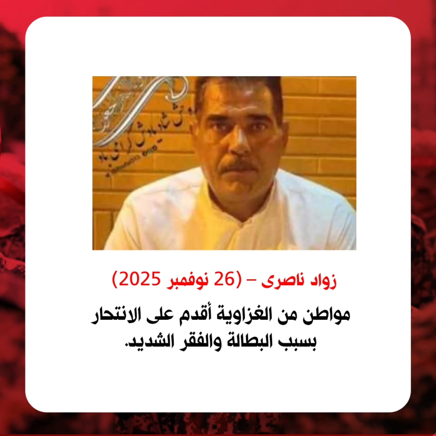 أحدث حالة انتحار اطلعنا عليها حدثت في مساء يوم الأربعاء 26 نوفمبر 2025. وفي قرية الغزاوية المعروفة بأراضيها الزراعية الخصبة والواقعة على بُعد 10 كيلومترات شرق نهر كارون. ففي الغزاوية انتحر شنقا “زواد ناصري”، المعروف بعبد الحسين المعتوق الجبور. وبحسب ذويه كان “زواد” يعاني ضغوطا اقتصادية وديونا متراكمة وبطالة دامت لفترة طويلة، فأوصلته هذه العوامل باجتماعها إلى حد الانهيار النفسي ومن ثم سارت به إلى الانتحار.