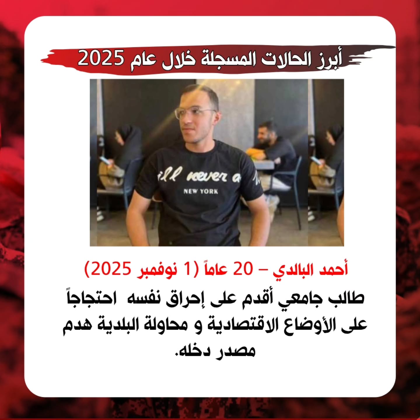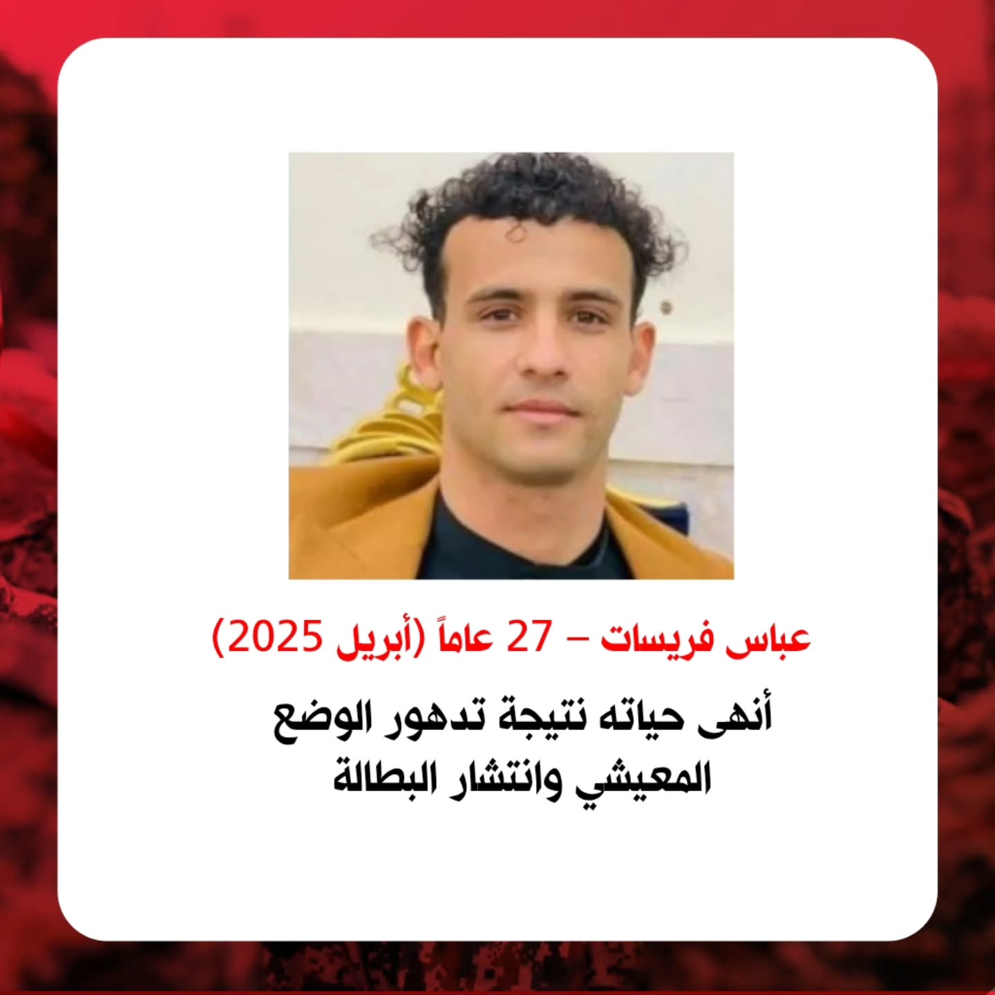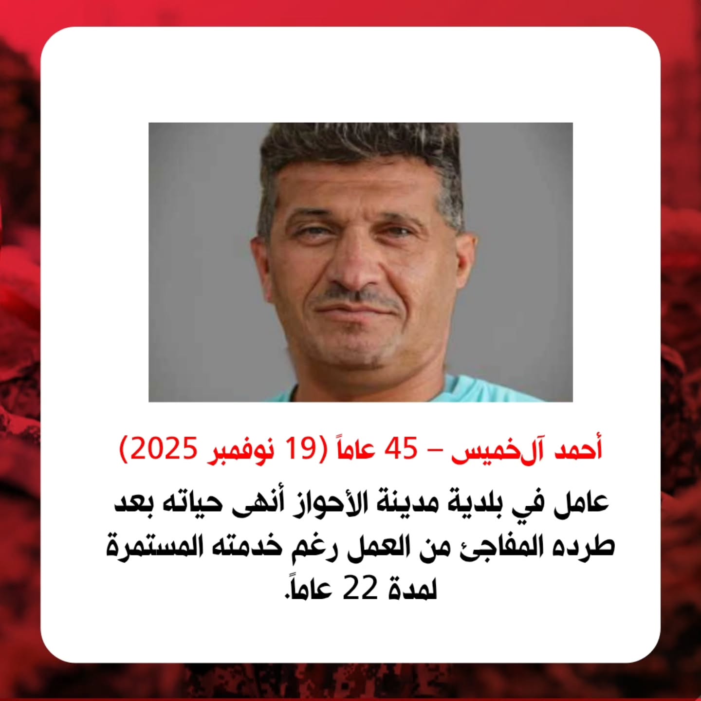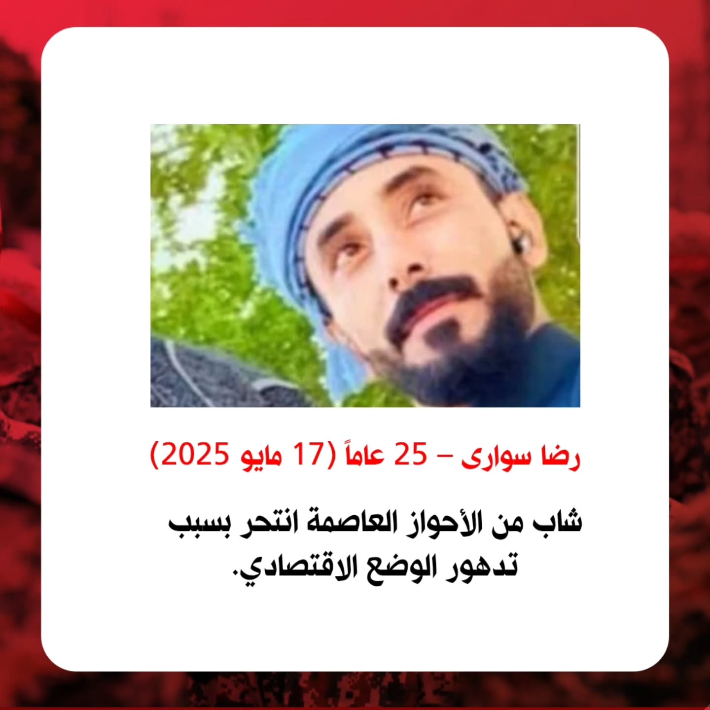 وانتحر في مدينة الخفاجية “عباس فريسات” وهو شاب ذو الـ 27، في أبريل 2025 (ارديبهشت 1404)، وانتحر رضا سواري في مايو 2025 (ارديبهشت 1404)، وانتحر مرتضى سنجري (باوي) ذو 18 عاما، في منطقة الغيزانية في نوفمبر 2025 (آذر 1404)، وانتحر احمد آل خميس في نوفمبر 2025 (آذر 1404) بعد ما إقالته البلدية الأحواز من عمله. ووجه الاشتراك بين كل هؤلاء هو الفقر والبطالة والتسريح من العمل.