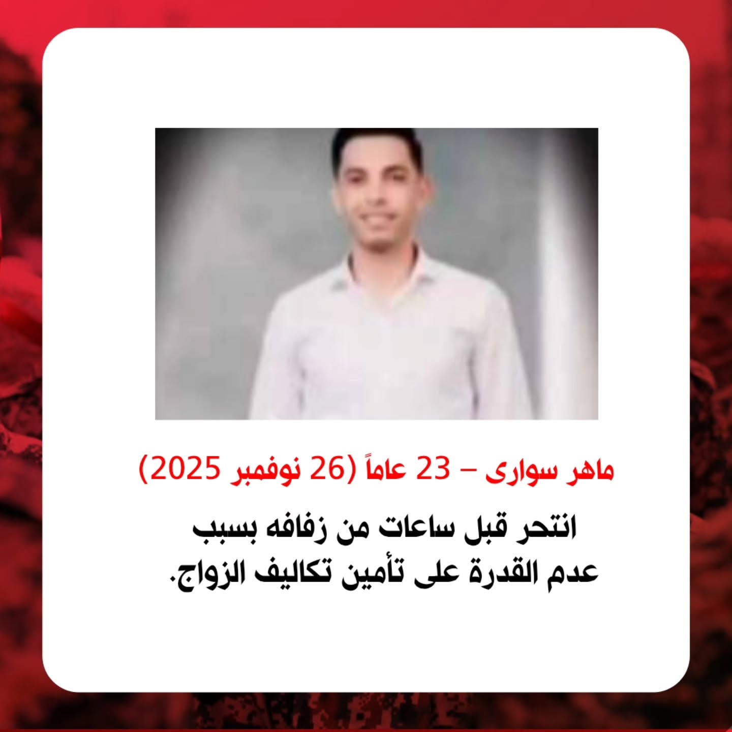 في نفس السياق، شهدت الأحواز وفي ذات اليوم حالة انتحار أخرى، حيث أقدم الشاب الأحوازي ماهر سواري، البالغ من العمر 23 عاماً، على إنهاء حياته فجر يوم الأربعاء، وذلك قبل ساعات قليلة فقط من موعد زفافه في منزل والده بمدينة القنيطرة (دزفول). وقد كان ماهر يواجه ضغوطًا معيشيةً هائلةً، وبحسب أفراد من عائلته أن عجز هذا الشاب في تغطية تكاليف الزواج كان السبب الرئيس وراء قراره بالانتحار.