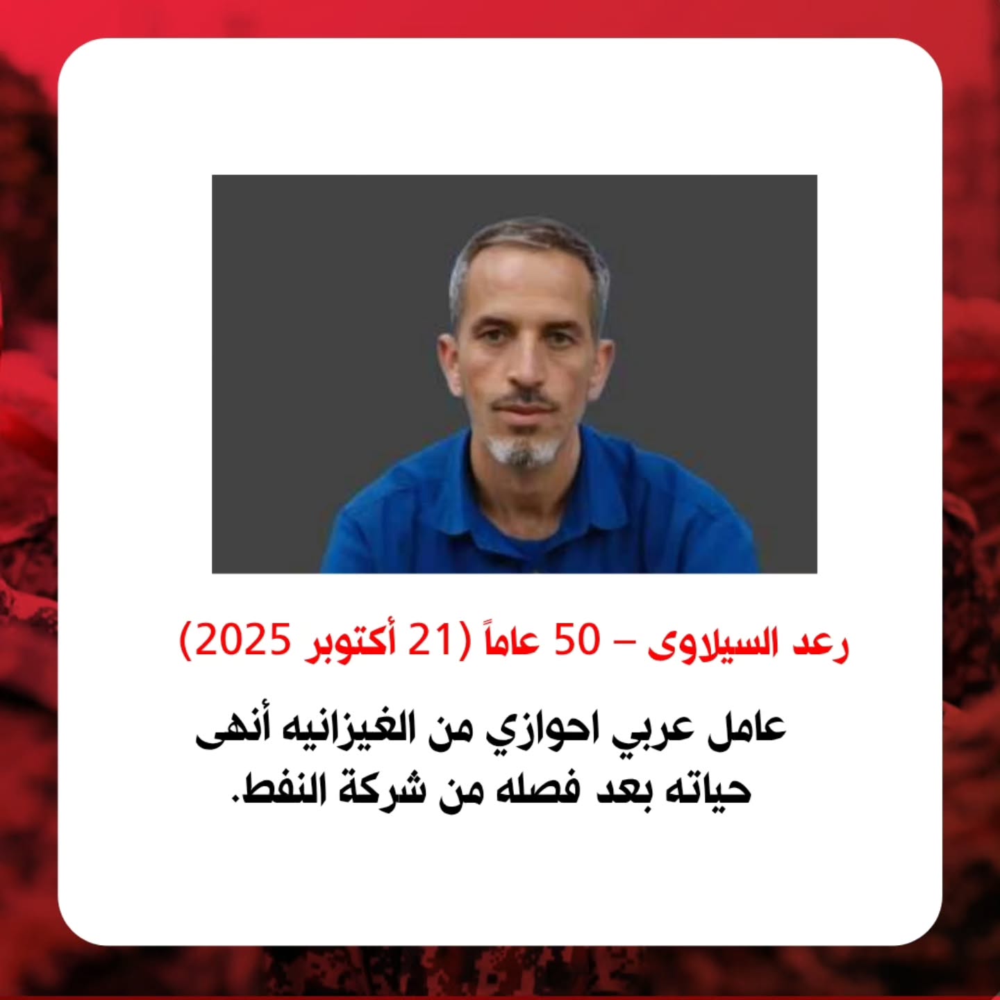 وانتحر رعد سيلاوي، بعد أقل من شهر، في 22 أكتوبر/تشرين الأول 2025 (30 مهر 1404)، وهو شاب وعامل أحوازي من منطقة الغيزانية الغنية بالنفط. وجاء الانتحار بعد فصله من العمل. ووصف نشطاء حقوق الإنسان الحادثة بأنها “تعكس نمطاً للموت بسبب البطالة”، وقد عكست منشورات على مواقع التواصل الاجتماعي، ومنها منصتي إنستغرام وتويتر غضبًا شعبيًا نتيجة هذه الحادثة المؤلمة.